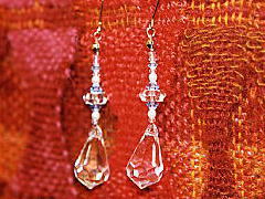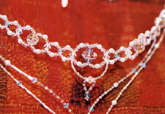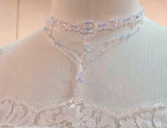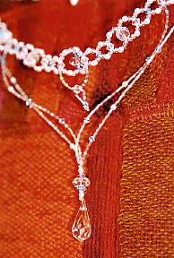 | 手元に長く持っていた涙型のスワロフスキービーズを活かしたデザインにするため、5種類のスワロフスキービーズにパールビーズとチェコガラスのシードビーズを使っています。 キラキラしたビーズをふんだんに使ったセットは、照明に映えて輝くでしょう。 下の写真のような首回りの大きく開いたドレスに似合うと思います。上のチョーカー部分を首にピッタリあわせるときれいです。 |