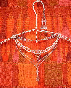 | 「未来展Vol.1」では、展示用にハンガーも手作りしました。 ワイヤーでハンガーの形をつくり、淡水パールを巻きとめてあります。 |