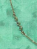 | 「フェンスに絡まるバラ」のネックレスというアイデアはずっとあったのですが、いざ形にしとするとなかなかうまく行かず、随分時間がかかった作品です。結局そのものズバリ、「巻きバラ」を使って仕上げました。リボンで作るバラです。チェーンの一部にくるくると巻いたパーツを使って、つるバラのイメージを出しています。おそろいのイヤリングは、シャワー台を使い、かなり厚みのある形になっています。 |