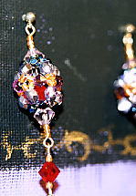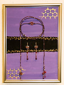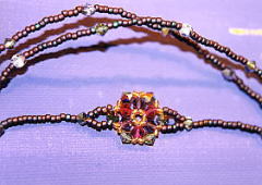 | 1mちかくあるかなり長めのラリエット(巻きつけ型のネックレス)です。使い方のバリエーションも広くなり、ベルトのように使うこともできます。ピアスもかなり大きめです。 金、銀、赤、紫、と派手な色使いの割には、シックな印象になりました。 |