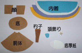 | こちらはお雛さまの材料です。 杓子の替わりに 扇になります。 |