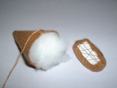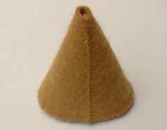 | 胴体を作ります 底用のフェルトの周りを ぐし縫いし、 厚紙をくるむようにして形を整えます。 胴のフェルトを 三角になるように縫い、 綿をたっぷりと詰めます。 胴と底を 縫い合わせます。 |