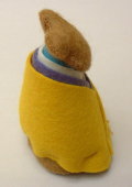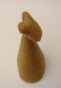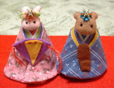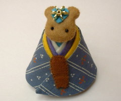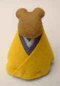 | 着物を着せて 出来上がり 上着を着せて、前の合わせのところで 軽く留めます。 杓子は、フェルトを2枚重ねて切り抜き、 周りをかがります。 杓子を縫い付けて できあがりです。 |