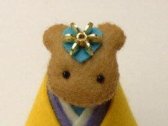 | 顔を仕上げます 頭飾りのフェルトを好きな形に切り、 飾りビーズで留めます。 目をつけます。 今回は ビーズをつけましたが、 刺繍糸でフレンチナッツステッチにしても かわいいです。 目の色は 黒でなくても良いようです。 |