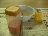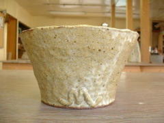 | 8月29日 色付け いよいよ素焼きが出来ました。 今日は、釉薬をかけます。 まずは、水で絞ったスポンジで表面の粉を ふき取ります。 そして、撥水材を底の糸尻の部分に塗ります。 これを塗った部分には釉薬がつきません。 釉薬は「マット白」というのを選びました。 艶のない、ちょっと黄色っぽい土色になるようです。 釉薬をかき混ぜます。これがとても気持ちいい。 なめらかな感覚です。 思いきって斜めに入れて、ぐるっと一周まわします。 持ち上げて余分な液をよーく切って できあがり。 しばらく乾かした後、撥水材の上に残った液を スポンジでふき取ります。 |
