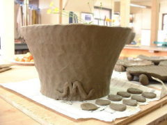 | 6月28日 土こね〜形作り 土は1kgを ほぼ全部使っています。 縄文土器と同じ、ひも作りという方法。 今回は指のあとが作品にあっているので、 そのまま残しました。 横に並んでいる 箸置きのようなものは、 実はボタンです。 (向こうに見えるのは、誘ってくれたyukkyさんの 作品、ほんとうのホタテ貝で型取りしたもの) |