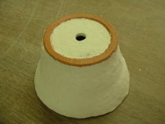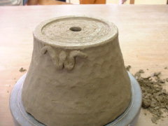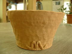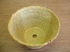 | 7月2日 成形(削り) 半渇きになったところで、削って成形します。 植木鉢なので 穴をあけました。 口側は、自然な山並みを活かしてます。 ミミズさんは 名前の頭文字M、サインの代わり。 |