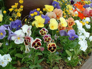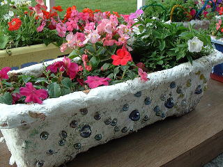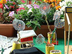 | 小学生コンテナガーデン広場は 各校 4つのプランターを使って展示しています。 石膏を塗ってビー玉を埋めこんだプランター。 このアイデアは家でも使えそう。 |