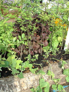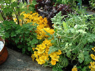 一等賞になった「おいしい庭」 植えてある植物のほとんどが食べられるのです。 垣根はサンショウ、小さなスイカまでありました。 |