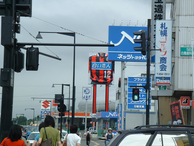 | 地下鉄福住駅を出ると そこには巨大なコンサドーレサポーターが・・ そして少し霞んで 札幌ドームが見えています。 札幌ドームは サッカーJリーグ・コンサドーレ札幌の ホームグランドのひとつです |
