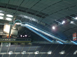 サッカーコートの出入口。 その前に立ちはだかる客席は、 左右の客席の下に移動するそうです。 コンクリートの壁までが可動席。 |