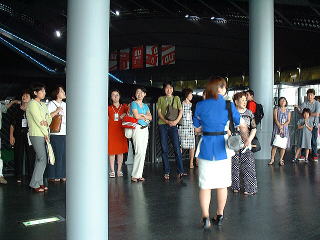 | いよいよ ツアーの始まり。 案内のお姉さんに連れられて、 30人くらいで1チーム、1時間ごとに出発です。 札幌ドーム最大の特徴が 天然芝のホヴァリングサッカーコート。 これを出し入れして、野球もサッカーもできるように 作られています。 |