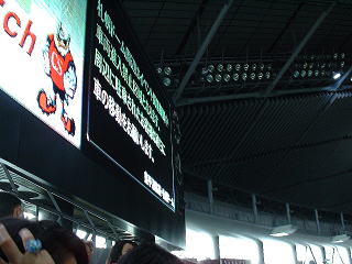 | バックスタンドの電光掲示板は 25mプールと同じ大きさだそうです。 時計とサッカーの45分計、野球のカウンターが ついています。 |