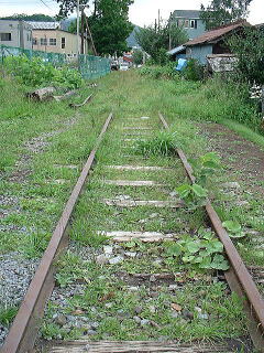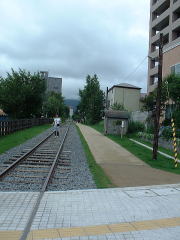 | 駅から運河に向かって歩いて行く途中に 北海道最初の鉄道・旧手宮線の跡があります。 今は整備されて こんなになっていました。 ちょっとイメージが・・・ |