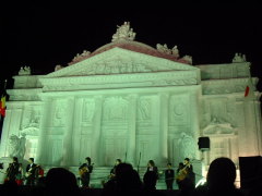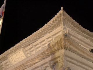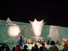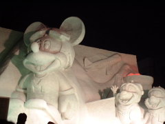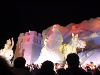 | 4丁目から11丁目まで 大雪像や市民の作る小さな雪像が 並びます。 やはり キャラクター物が多い中、 今年の目玉は 韓国の「光化門」でしょうか。 ワールドカップ韓日協同開催を記念して 制作されました。 雪像前の舞台では 様々な催しがあります。 この時は 「アリラン」を歌っていました。 |