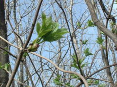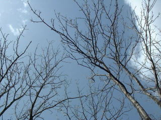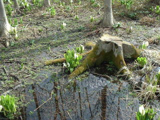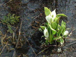 早春の雑木林の中、 木々はやっと芽が膨らんできたところ、 木漏れ日のさす 明るい水辺で ミズバショウが咲いています。 |
