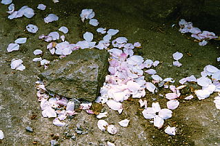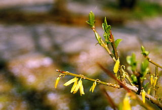 | 黄色いつりがね型はレンギョウ 散り敷くサクラ 寄りそうツーショットは何の芽だろう? |