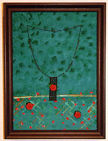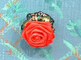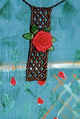 | 「フェンスに絡まるバラ」のネックレスというアイデアはずっとあったのですが、いざ形にしとするとなかなかうまく行かず、随分時間がかかった作品です。結局そのものズバリ、「巻きバラ」を使って仕上げました。リボンで作るバラです。チェーンの一部にくるくると巻いたパーツを使って、つるバラのイメージを出しています。おそろいのイヤリングは、シャワー台を使い、かなり厚みのある形になっています。 |