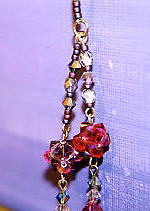 | 1mちかくあるかなり長めのラリエット(巻きつけ型のネックレス)です。使い方のバリエーションも広くなり、ベルトのように使うこともできます。ピアスもかなり大きめです。 金、銀、赤、紫、と派手な色使いの割には、シックな印象になりました。 |