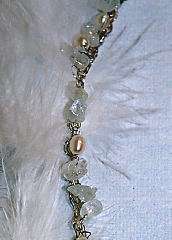 | 細い銀線を鈎針で編む手法で作ってあります。 先に全部のビーズを通しておいて、一目に一個ずつ入れながら編むので、始めに通す時から全体のバランスを考える必要があります。 とてもシンプルなのでドレスは選ばないと思いますが、ドレスの襟ぐりに合わせて、長さを調整するのが良いでしょう。 |