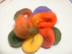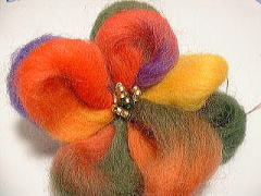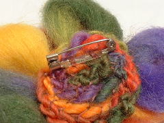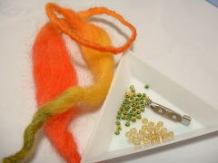 | 材料は 最近はやりの ぷくぷくした毛糸、 ビーズ、ブローチピン、縫い糸 です。 道具は、かぎ針と縫い針です。 |