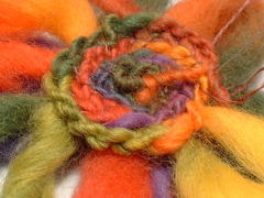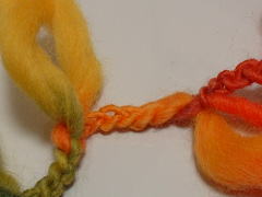 | まずは、くさり編み 毛糸の細くなった部分だけを、 くさり編みにします。 太い部分は編まずに、次の細い部分に 続けます。 太い部分が輪になり、これが花びらに なります。 花びらを7つ作って、2〜3目で切ります。 |