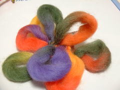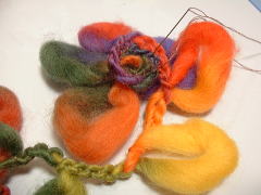 | 根元を縛ります 花びらの輪を集めて、残りの糸で 根元を数回巻いて きつく縛り、 留めます。 |