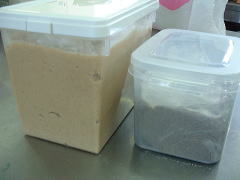 | 普通の大豆味噌の方は カビらしきものはなく、 かなり水が上がり、 隅には水が溜まっていました。 水分は捨てて、ボールにあけます。 こちらも 麹の粒が見えます。 少しなめてみたら、とてもしょっぱい。 まだまだ熟成はこれからのようです。 温度が低過ぎたのかもしれません。 それでも匂いは 味噌です。 こちらも 容器に詰めて重しを。 再び、おやすみなさい。 2003.04.01 |