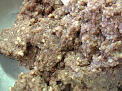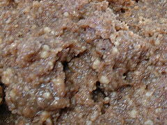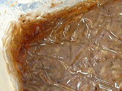 | 2回目の返し 今回は黒豆味噌にも カビらしきものはなく、 周辺には溜まるくらいの 水が上がっていました。 味噌もしっとりと滑らかに なっているようです。 色は、小豆色に近いです。 きゅうりにつけて生食してみました。 普通に味噌の味でした。 豆自身の甘味のせいか、 生食に良さそうです。 2003.06.06 |