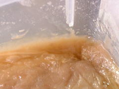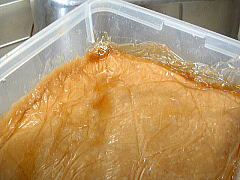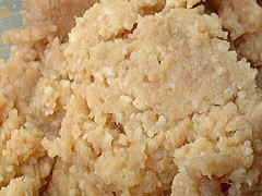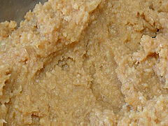 | 大豆の味噌です。 表面に溜まるくらい 水が上がっていました。 ボールに開けると 味噌の香りが漂いました。 見た目も滑らかになっているようです。 こちらも生食してみました。 味噌の風味は充分ですが、 やはり塩辛いです。 熟成が足りないのかと思っていましたが、 こういう味のようです。 2003.06.06 |