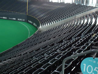 | 説明を聞いている、 この外野スタンドの席で地上2階の高さ。 正面、バックスタンド側最上部で 地上4階の高さだそうです。 人工芝の野球場がゲーム盤のよう。 |