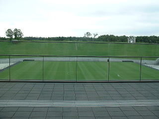 サッカーコートの出入口。 その前に立ちはだかる客席は、 左右の客席の下に移動するそうです。 コンクリートの壁までが可動席。 |
