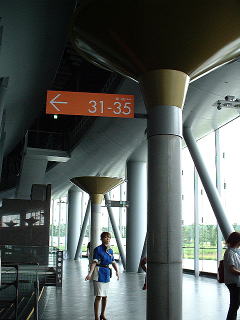| グランドの外回りの廊下はガラス張りで ちょっと外国のエアポートの雰囲気。 自然光が差し込み、明るいです。 ガラスには、その方向にある都市の名前が゙ 書かれています。 大きいほど近いのだとか。 |