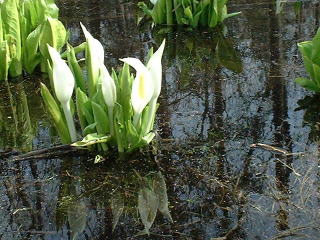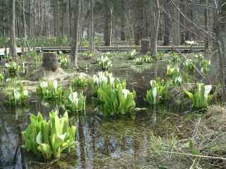 | 本州では信州・尾瀬が有名なミズバショウ、 北海道では平地で咲いています。 中でも 手稲区の星置緑地では JR駅から徒歩5分という場所で 自然の群生を見ることができます。 |